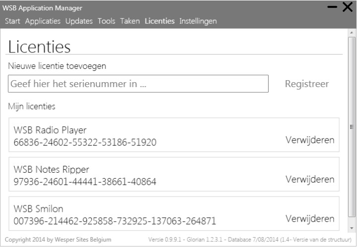 Wanneer je een licentiesleutel hebt aangeschaft voor één van onze applicatie, dan kan je deze activeren via de applicatie zelf of via de licenties tool waarover de WSB Application Manager beschikt. Verder krijg je in deze tool een mooi overzicht van alle licentiesleutel -